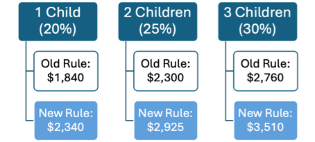 The percentages that apply to children (20 % for one child, 25 % for two, 30 % for three, etc.) remain the same under the law. What changed is how much income is subject to those percentages due to the higher cap.