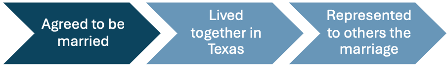 Under the Texas Family Code, two people are common law married if they can prove they meet three requirements. First, they agreed to be married. Second, they lived together in Texas. Third, they represented to others that they were married.